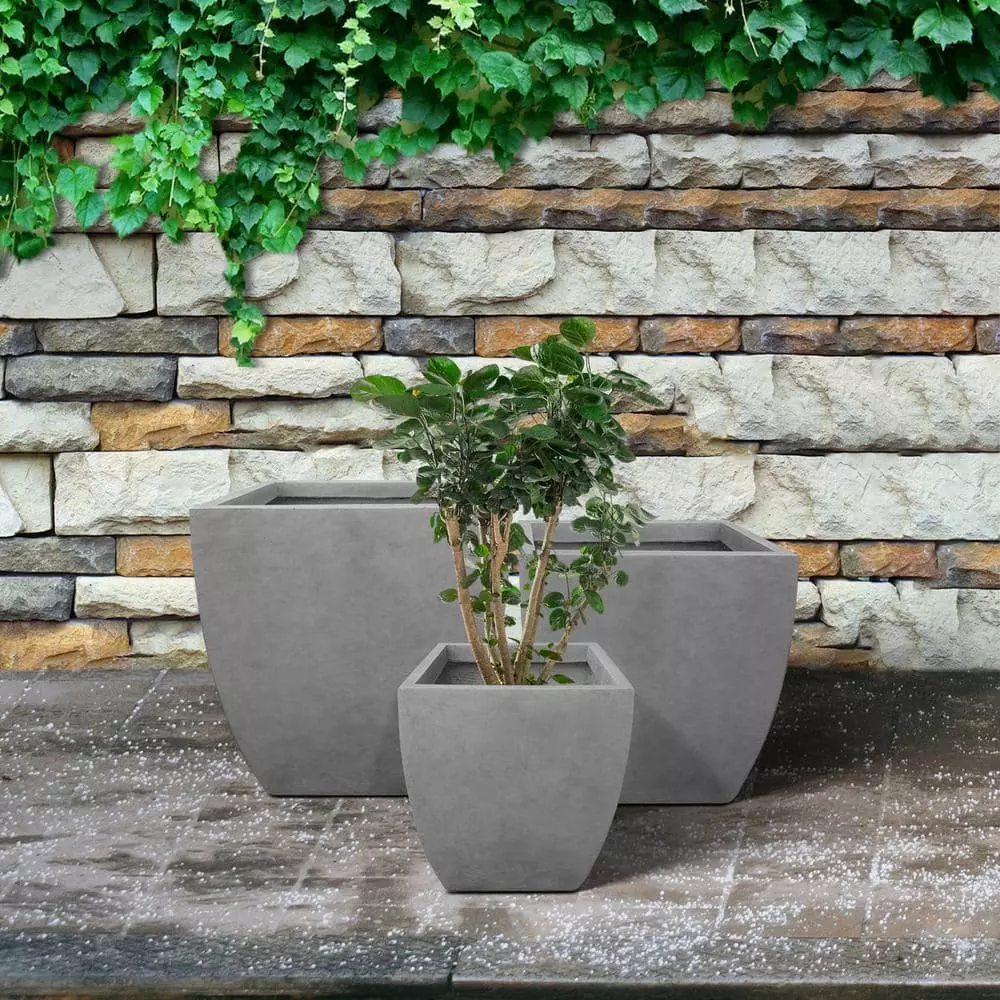 The flared square design coupled with delicate curves differentiate these planters from other common trends. The visible pores showcase the uniqueness of concrete. These elegant square planters have authentic concrete finish with visible pores make them beautiful contemporary pieces. The look and feel is true concrete but it weighs substantially less than it looks. It also has very smooth finish instead of rough concrete potters you might be used to. The size is very generous and can hold a good amount of plants without looking crowded. It does have a more modern feel to it being straight lines and concrete. Would look great on apartment balcony or large backyard patio. Made of lightweight concrete through an ecofriendly manufacturing process. This material has all the advantages of concrete such as strength, durability, weather and damage resistance. Materials involve cement and weather-resistant fiberglass.