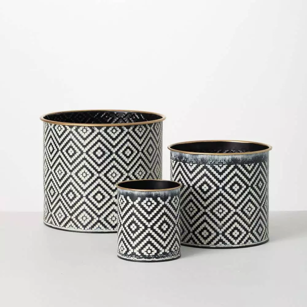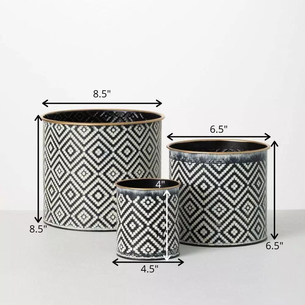 Conveniently coordinated into a band of 3, this trio of decorative metal planters make the perfect addition to any space. Grouped in 3 different sizes, they are wrapped in a black patterned design and finished with gold trim. Over the last 52-years, Sullivans has become an industry leader in home decorations. Our brand is rooted in tradition while incorporating modernized trends to keep your home looking up to date with timeless style. Here at Sullivans, we pride ourselves on creating product designs focused on quality and value, ensuring that our customers have access to beautiful products at reasonable price points.