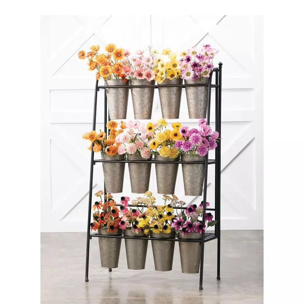 • Piece features 3 elevated rows and comes with 12 metal vases