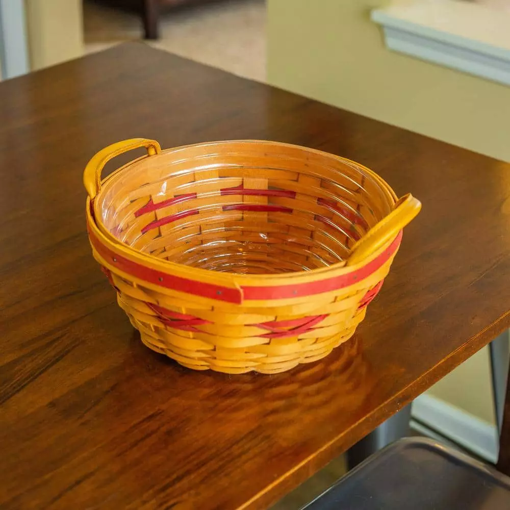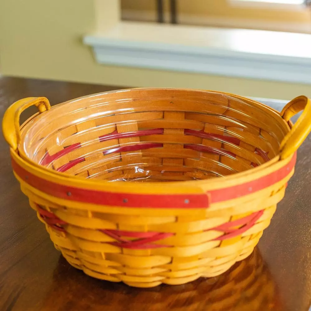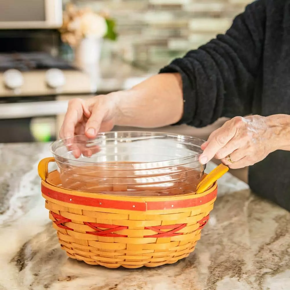 Clear saucer blends with baskets, ceramic, and plastic planters